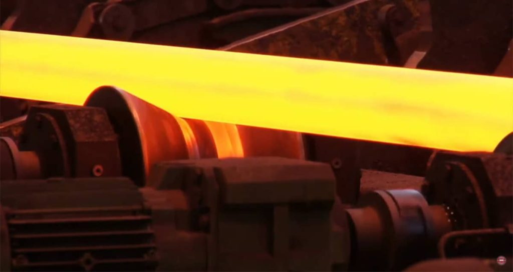 A bright yellow metal bar being heated to high temperature in a rolling mill.