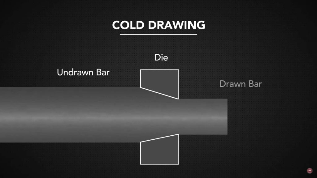 Diagram illustrating the cold drawing process, showing an undrawn bar pulled through a die to form a drawn bar with reduced cross-section.