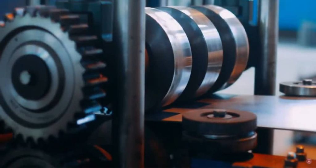 Rolling machine used in cold working, showing rotating rollers and drive components applying force to metal material.